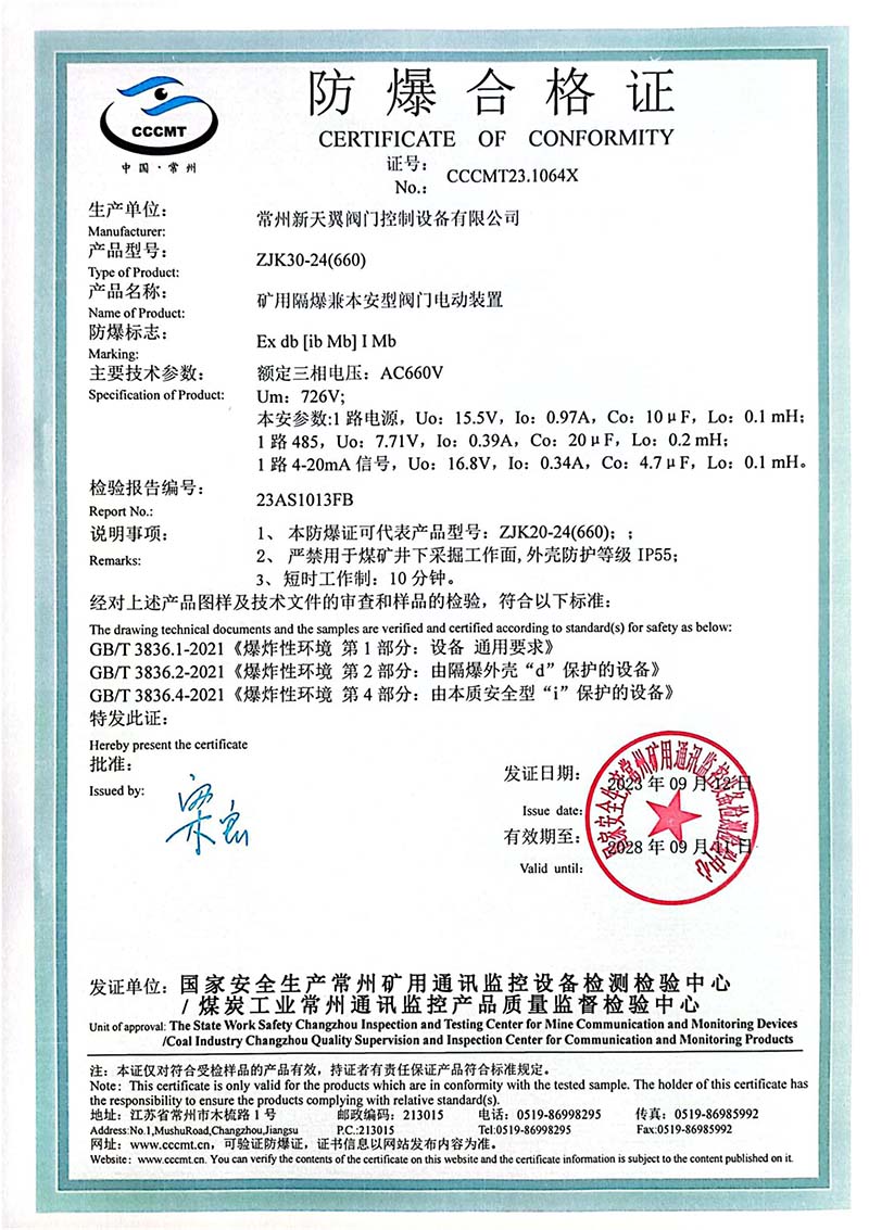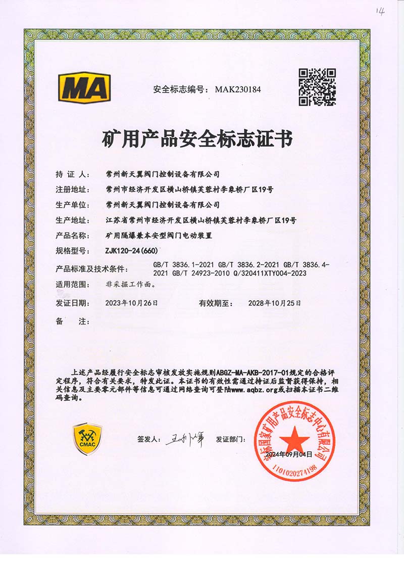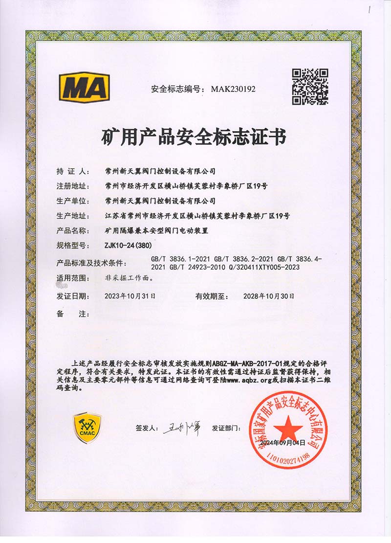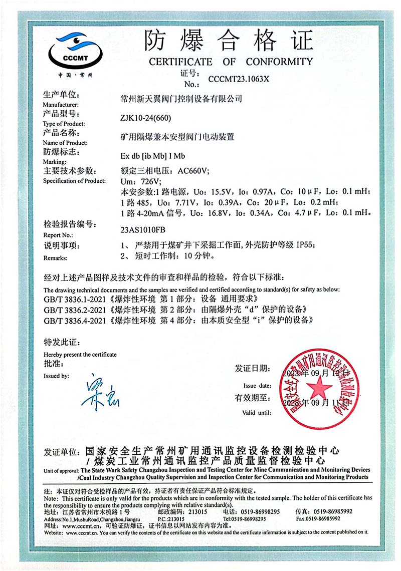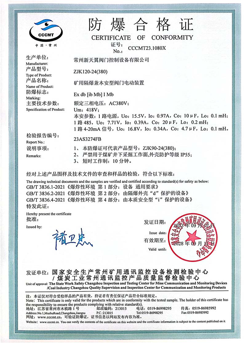 礦用隔爆ZB10-24中國國家強制性產品認證證書110.2