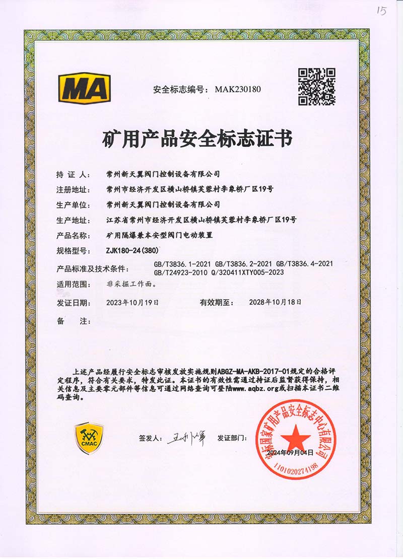 礦用產品安全標志證書KXBC-1 15 660(380)DZ