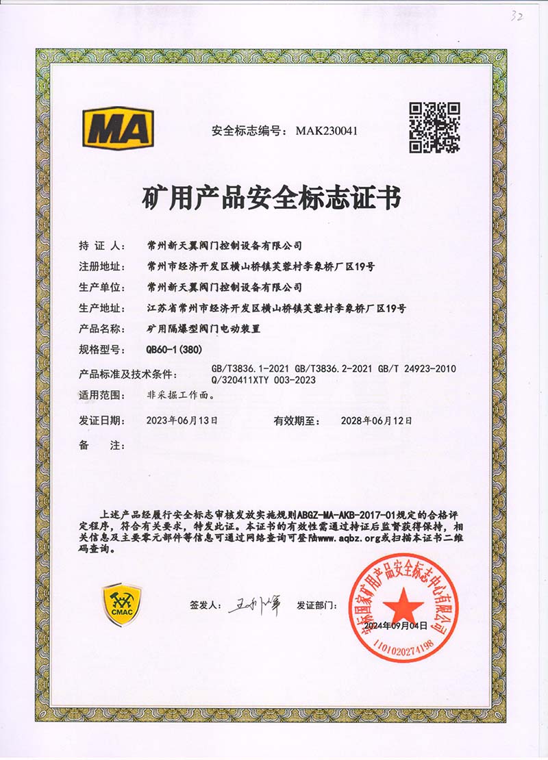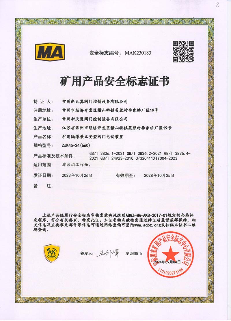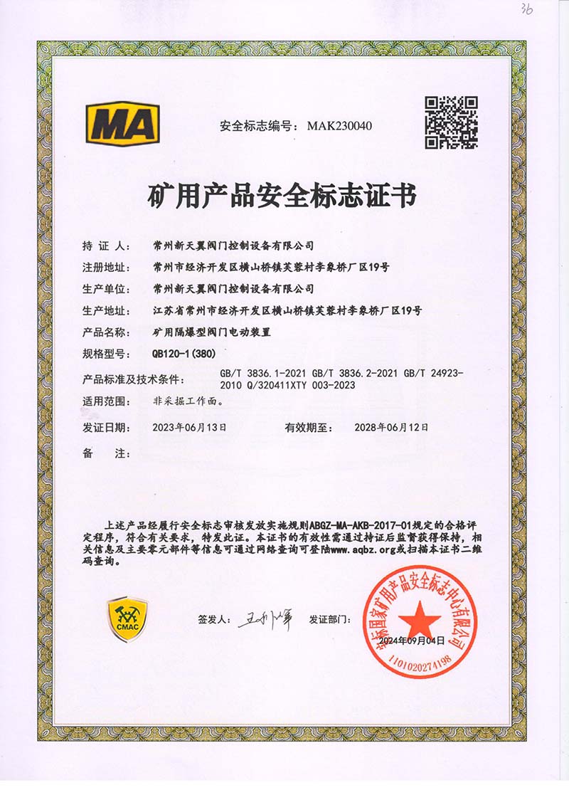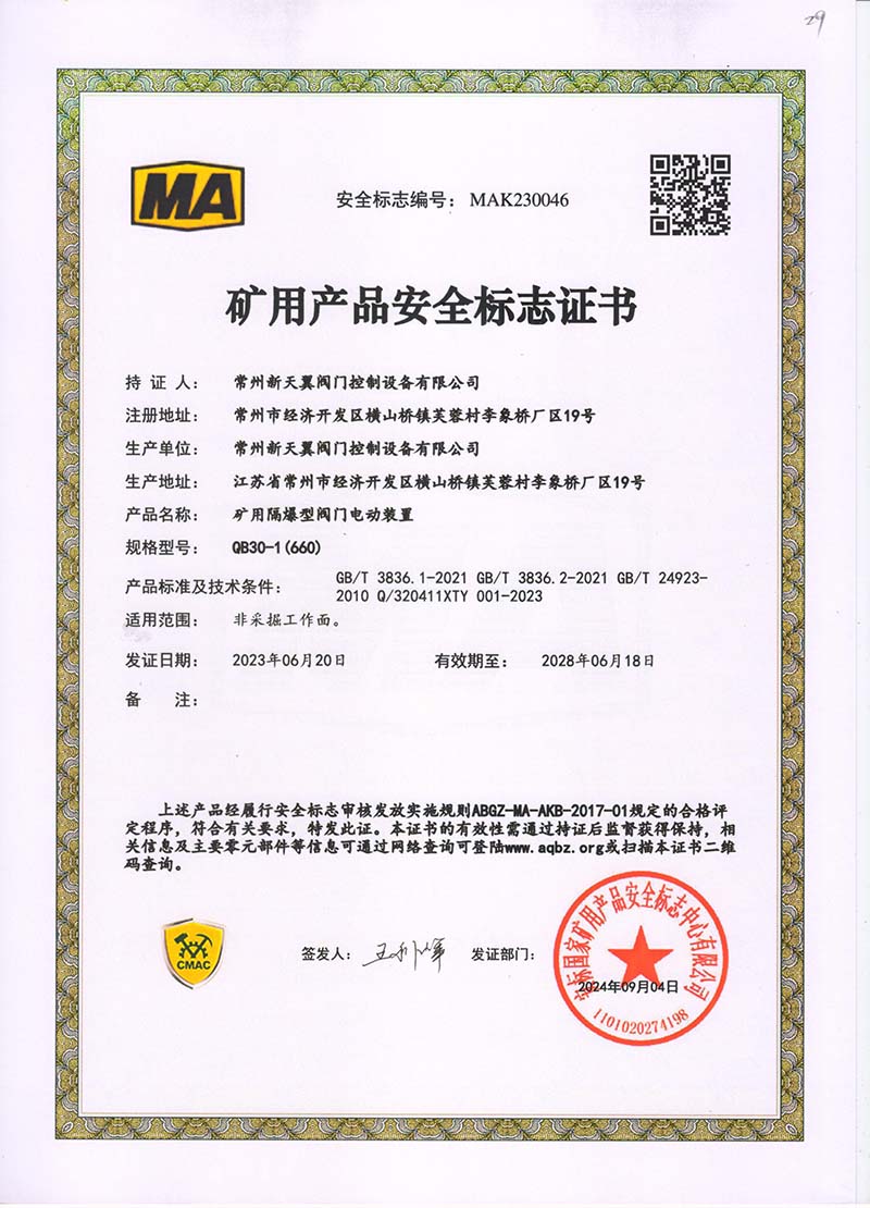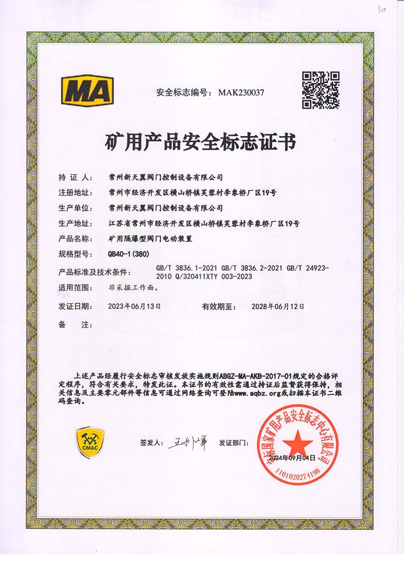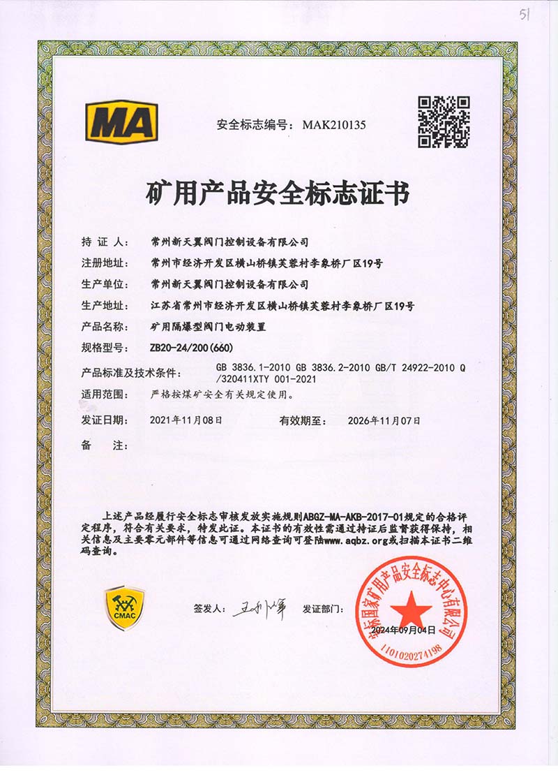 礦用隔爆ZB10-24中國國家強制性產品認證證書110.1